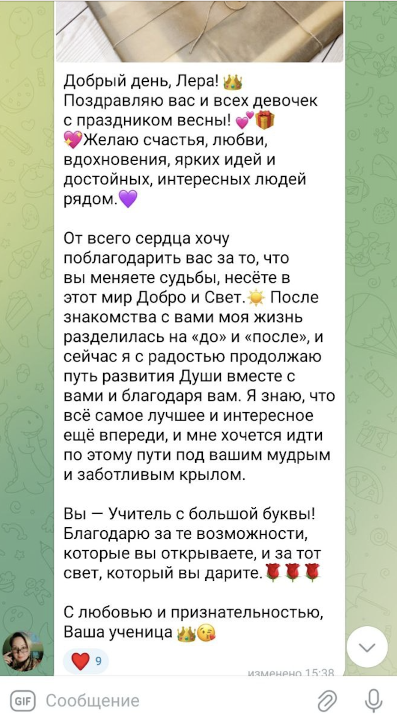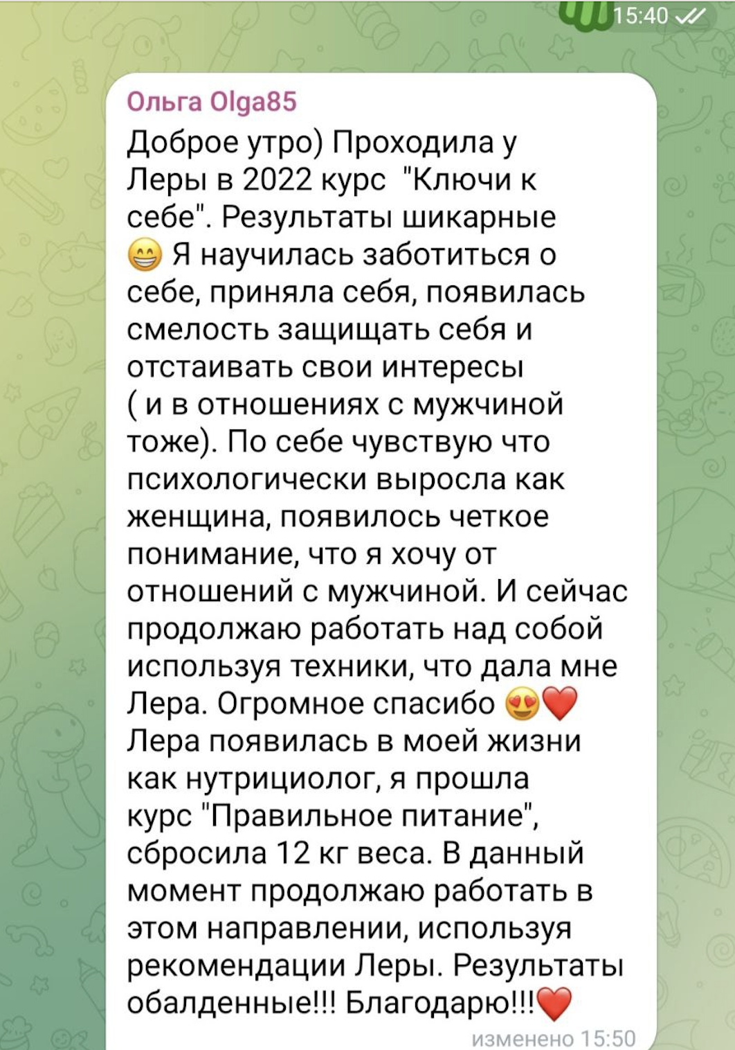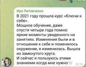 Я стала лучше понимать себя саму и четко знаю свой путь! Определены цели в жизни и поставлены сроки исполнения! Даже семейные отношения вышли на новый уровень!!!