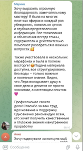 Хочу выразить свою благодарность и признательность замечательному человеку, профессионалу своего дела, Валерии Смирновой. Мне повезло, и я знакома лично с этой женщиной. Она, благодаря своим знаниям, помогла разобраться во многих причинах и неудачах, которые меня постигали.